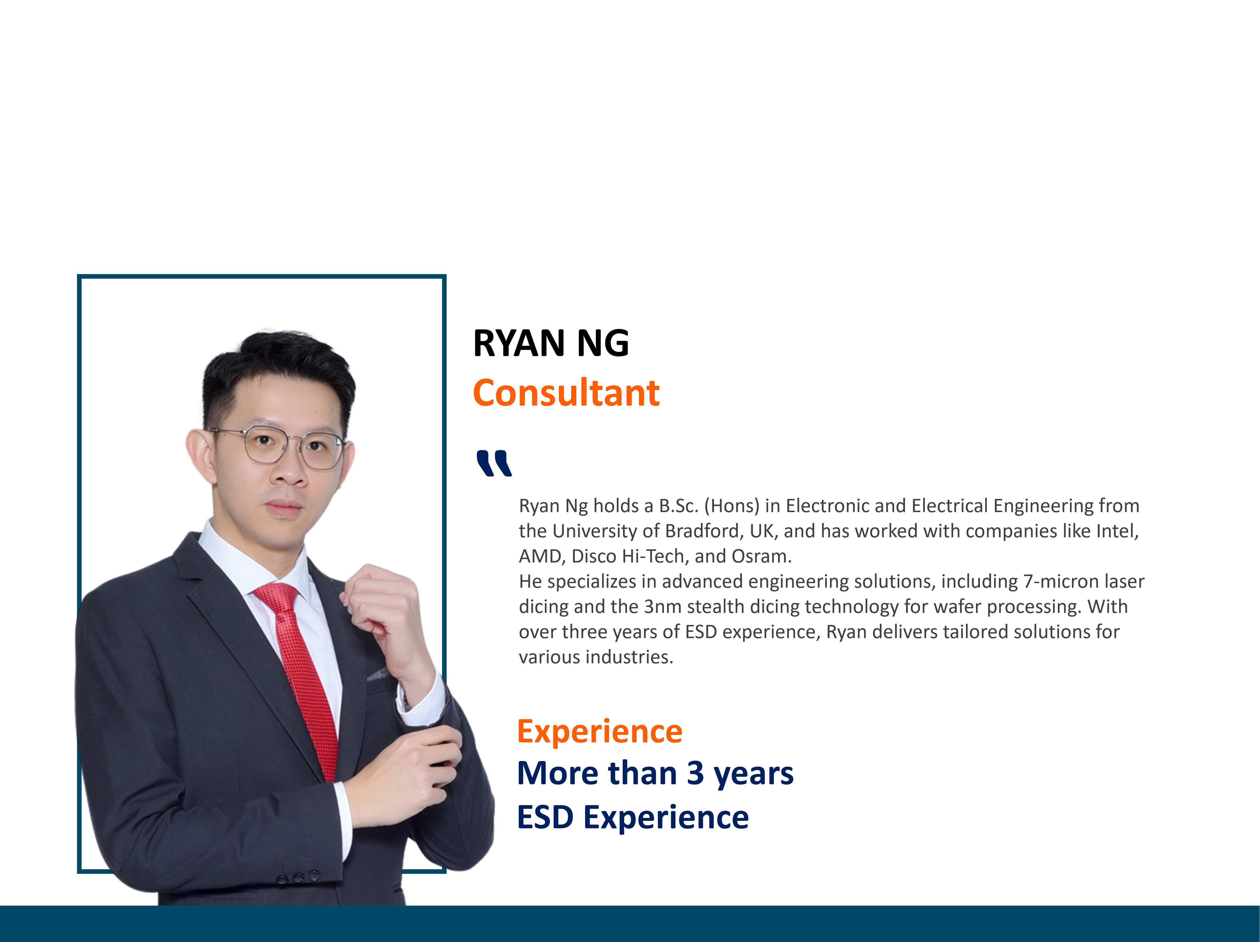 • Currently, Ryan has over three years of ESD experience, specializing in providing tailored ESD solutions for various industries.